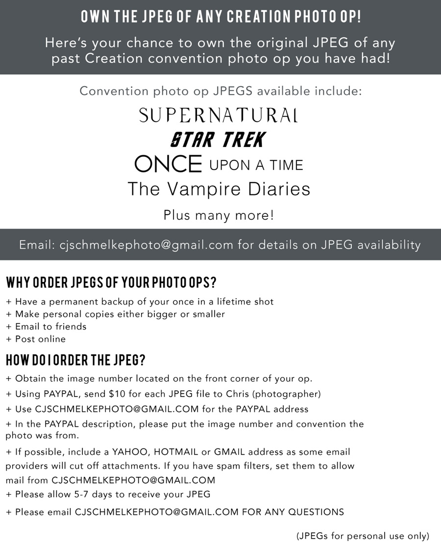 By attending Creation events, you agree to allow your image to be used on our website and in news documentaries or stories, either filmed by Creation Entertainment or other entities.
