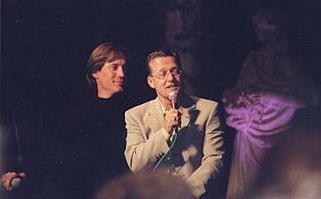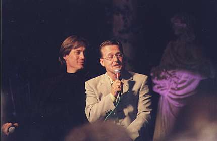 | For many fans the most dramatic (and also tearful) moment of the weekend was the appearance of Kevin Sorbo and Michael Hurst on stage together. Their very first in the United States, loyal Hercules fans had come from all over the world to witness this moment: a thank you from both sides of the stage for the great work on the recently ending series. The affection these guys have for each other is indeed endearing. We spent a long time preparing a music video that we planned to show for the first time during their mutual appearance. We wanted to show memories of the past half decade and sum up how the audience felt about the two stars. When the lights dimmed and the video ran, we knew that our goal had been accomplished since many of the audience members, and both stars, had tears in their eyes. It was a great moment! | ||
